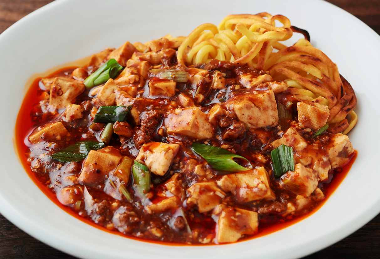 カリッと焼き上げた太麺に幸福麻婆豆腐のソースを絡めた一品。